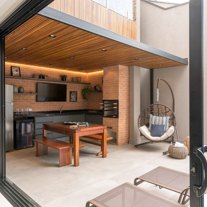 Você ainda pode usar a madeira em montagem de pergolados com churrasqueiras e, assim, deixar tudo com um elemento mais perto da natureza. Além disso, cadeiras e outros móveis feitos de fibra finalizam a composição.