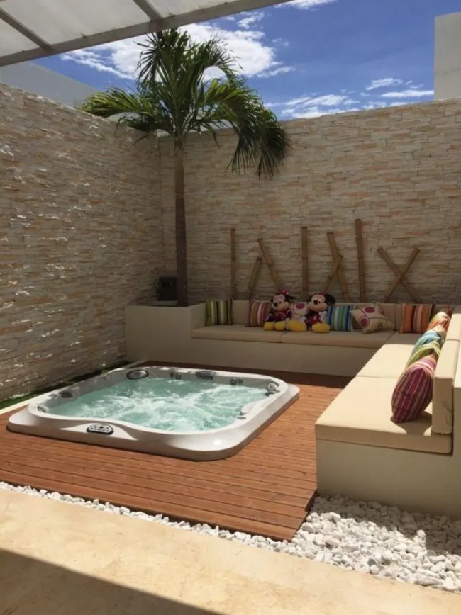 Nas áreas externas, você pode aproveitar e instalar uma jacuzzi ou criar uma área gourmet com churrasqueira. Isso também vai trazer mais conforto para você.