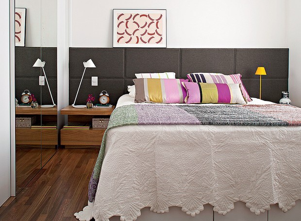 No caso deste modelo de quarto, é indicado almofadas em cores mais vivas, como amarela, azul, verde ou até mesmo em formatos diferentes e até desenhos abstratos como nestes exemplos abaixo: